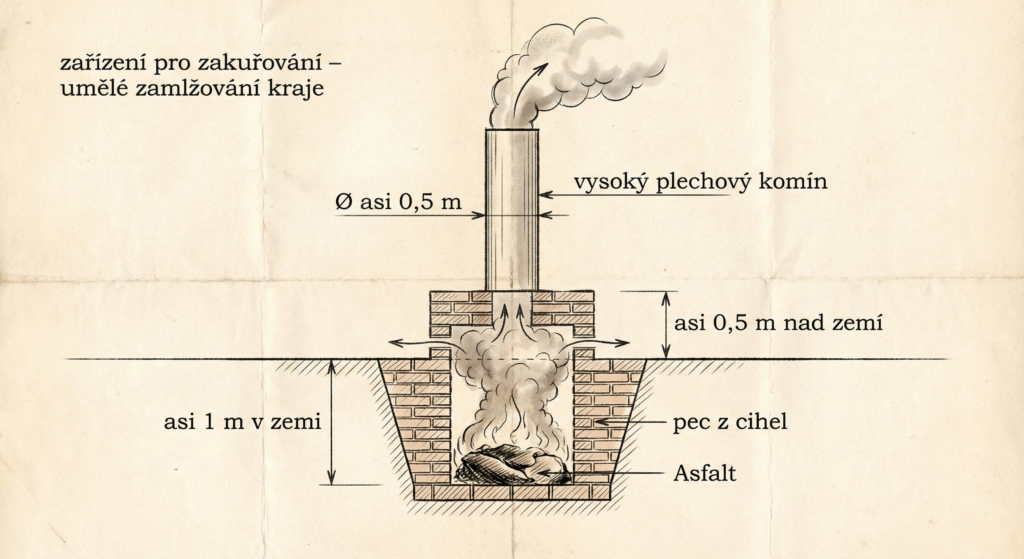 První „technickou“ informací, kterou Poláček ve svém spise popisuje, je rozložení protiletadlových obranných prvků v Krušných horách, konkrétně v oblasti Dlouhé Louky. Zde se měla nacházet zařízení určená k zakouřování krajiny – tedy k umělému zamlžování prostoru. Konkrétně hovoří o cihlových pecích zapuštěných přibližně jeden metr do země, s masivními plechovými komíny o průměru kolem půl metru, ve kterých se pálil asfalt za účelem vytvoření kouřové clony.